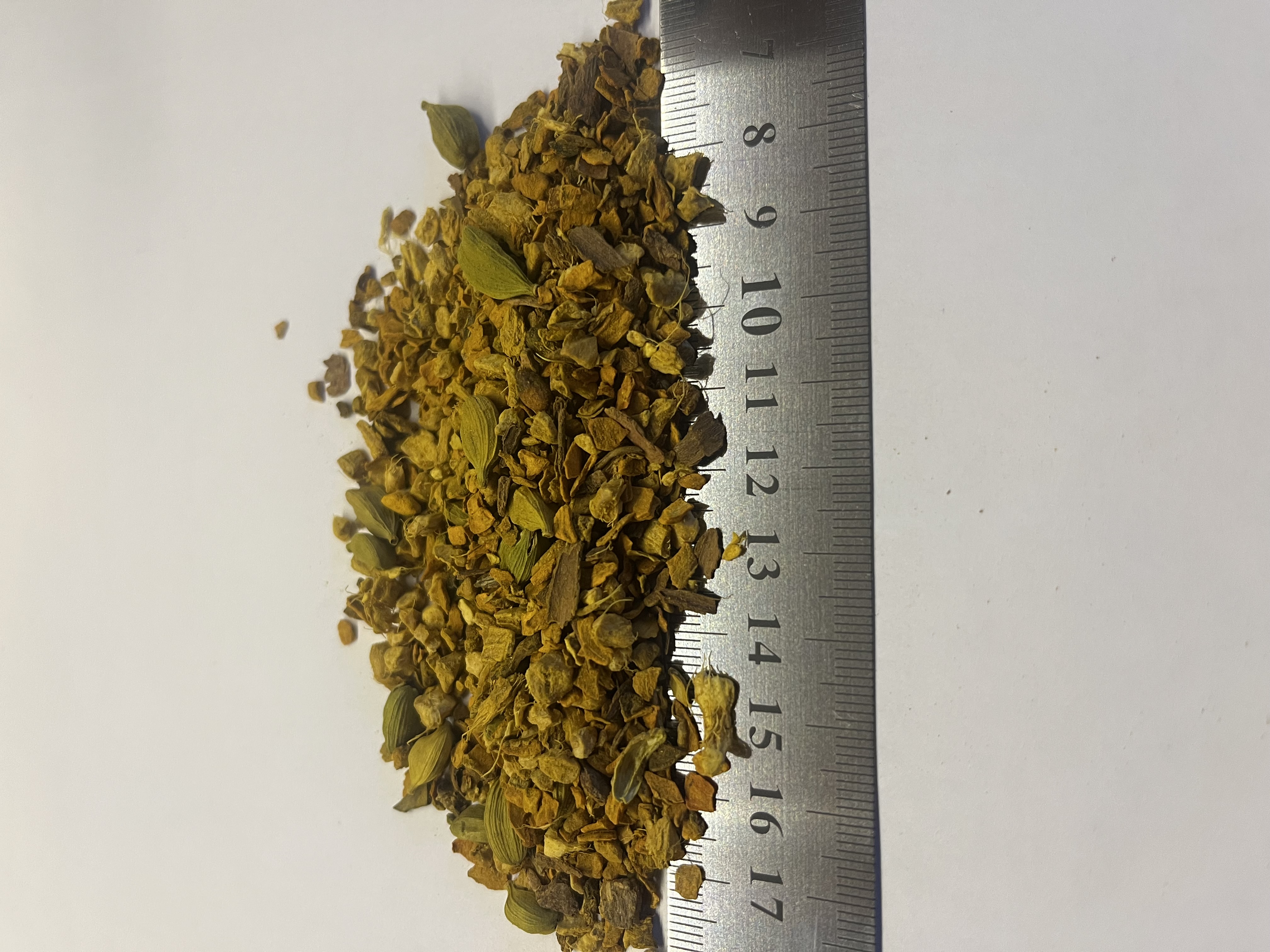 Жареная куркума (40%), имбирь (40%), смесь специй (10%), цельный кардамон (10%).